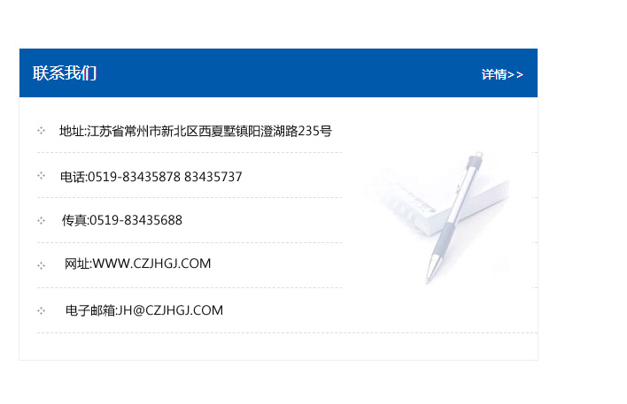 傳真:0519-83435688    郵編:213135    網址:WWW.czjhgj_com.nnwxhb.com    電子郵箱:JH@czjhgj_com.nnwxhb.com